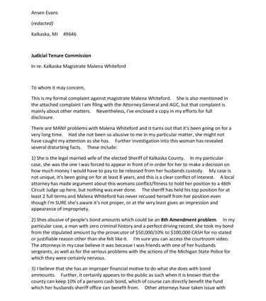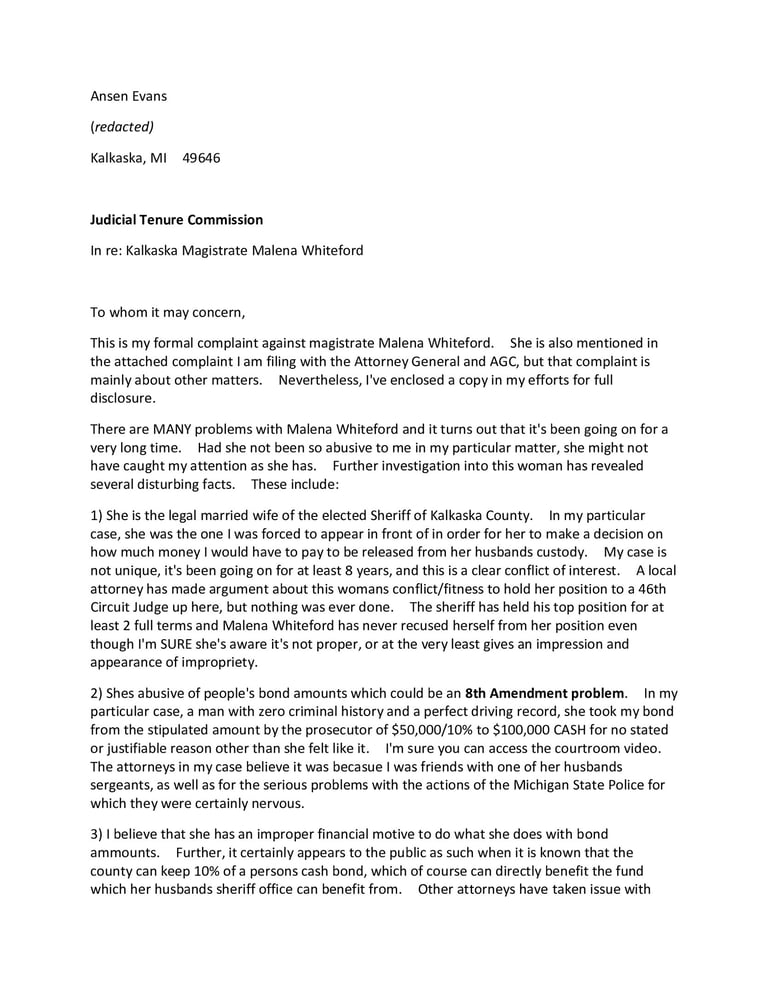 Judicial Tenure Complaint Against Kalkaska County Magistrate Malena Whiteford