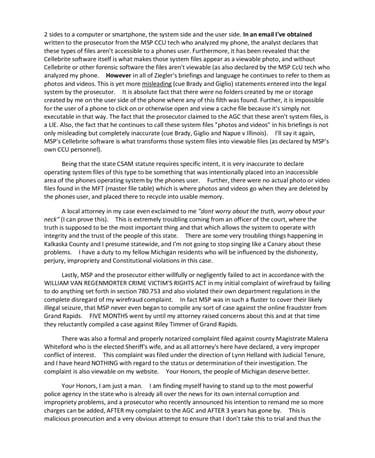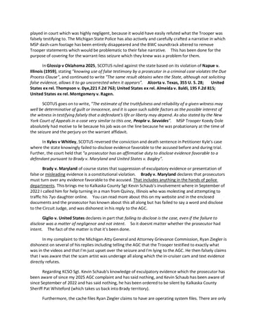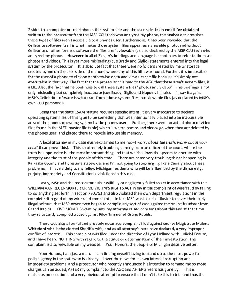 MSP Trooper Koedy Dole committed not only felony perjury on a search warrant affidavit with absolute motive to do so, but then committed perjury on the stand during my evidentiary hearing, grossly altering the facts and chronology of events during both the seizure AND the in-cruiser interview cam. Kalkaska County attorney Tom Seger failed to correct it or even request that the video be played in court. The prosecutor then either took it upon himself to type the false and misleading brief that he filed with the Court of Appeals, or was negligent in simply quoting the troopers false testimony that the camera footage doesn't support.