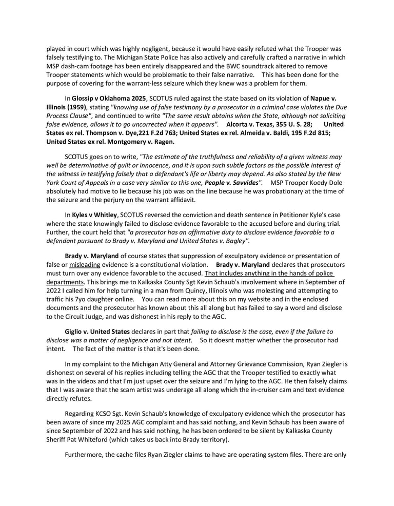 There are several US Supreme Court decisions which have been violated by Prosecutor Ryan Ziegler in protecting Koedy Dole and not correcting his perjury now that it is known, and Koedy Dole is guilty of felony perjury in court and perjury on a search warrant affidavit.